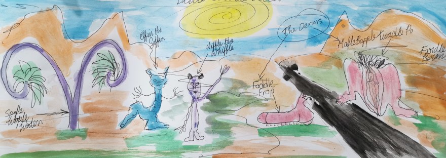 Begin to draw. Efin the Geffin with very big feet and Niffle the Whiffle, tall and thin, road, Spifle Wople Woden tree, dick. WTF? Dicks are are funny, especially with an animal head and caterpillar legs. Kunts with big feet are funny too. Mountain range, watercolours splashed on quickly. 8:50 new employee arrives early for work, text message please give me 10 minutes to complete this art work.